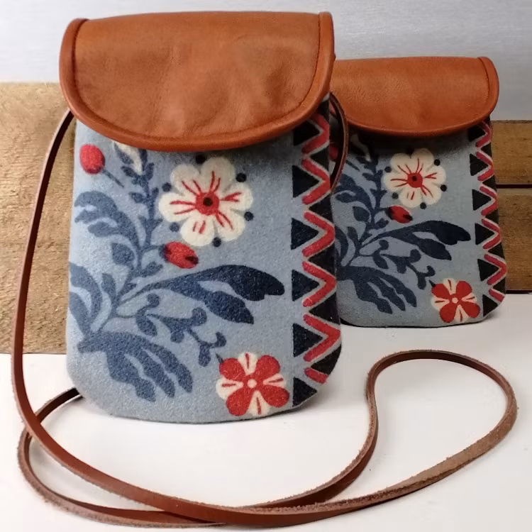Handgjord mobilväska med allmogeinspirerat mönster. Praktisk väska för din smartphone i ull och naturgarvat renskinn med reglerbar axelrem och bakficka.