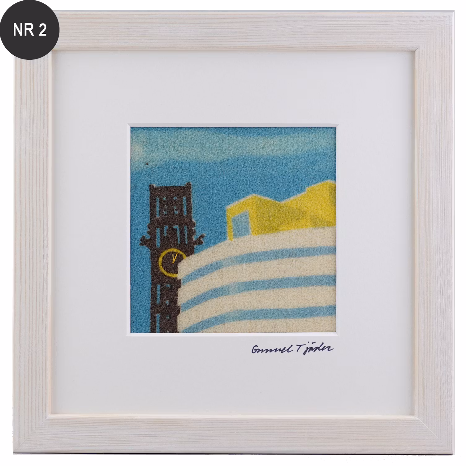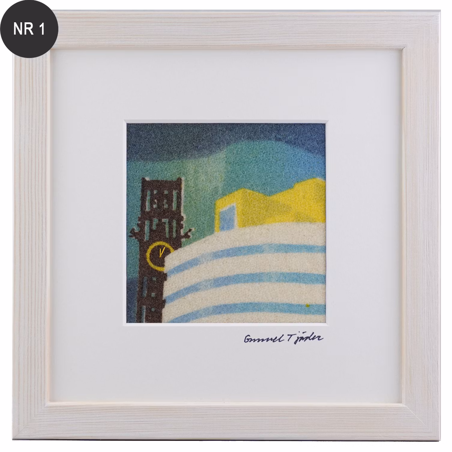 Tavlans motiv är handtryckt på ylle. Jag använder en flerfärgstryckteknik, det ger ulltryck som blir olika/unika för varje tryck. Välj din favorit bland motiven med Kirunas nya Stadshus och klocktornet som finns till salu just nu. Storlek 22,5 x 22,5 cm. Linoljelaserad ram, inget glas i ramen. Etikett med text om motivet finns på tavlans baksida. Design och textiltryck Gunnel Tjäder.